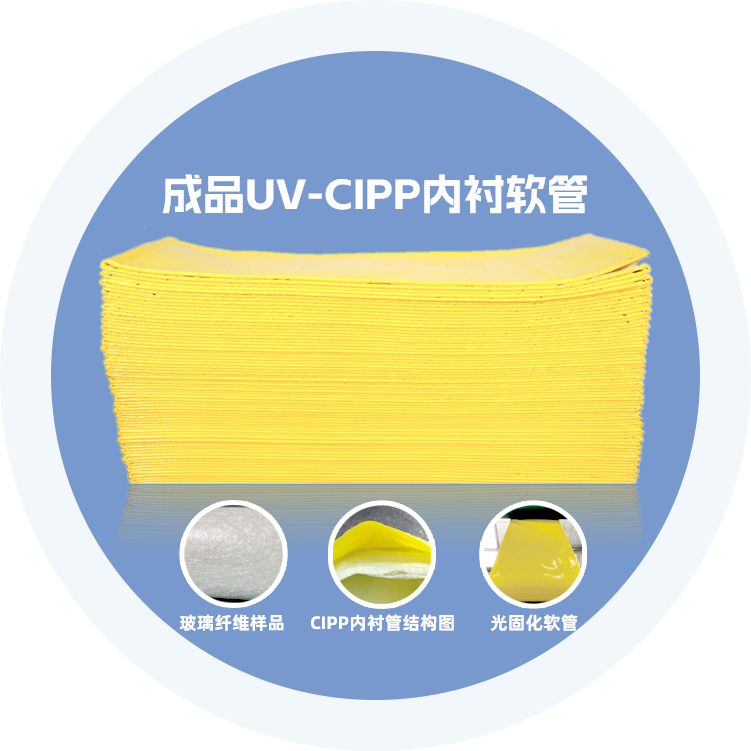 紫外光固化CIPP修复采用牵引设备将浸好树脂的玻璃纤维软管拉入待修复管道内,通过紫外线光固化车的加压设备,将压缩空气透入软管使其膨胀张开紧贴旧管 内壁利用紫外线灯照射含光敏的树脂层,引发软管发生固化反应形成一层坚硬的“管中管”结构,从而使已发生破损或失去输送功能的地下排水管道在原位得到修 复。